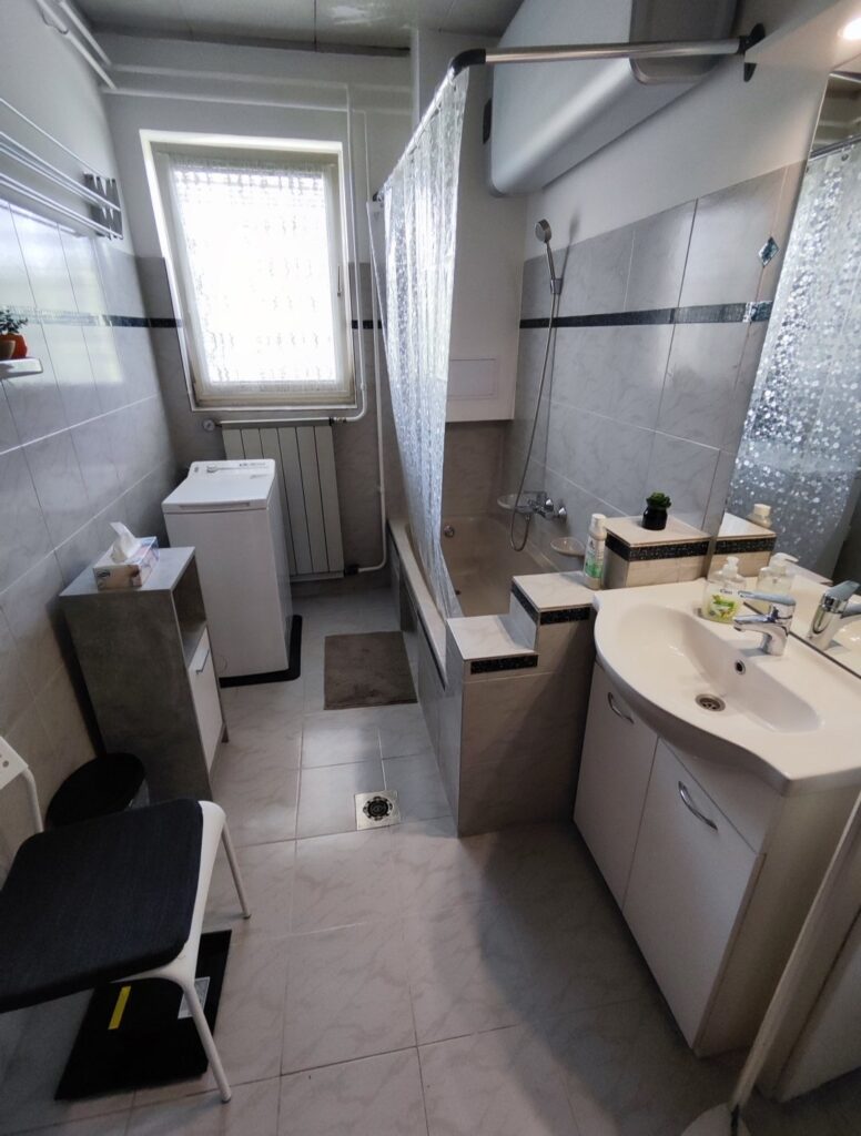 A fürdőszobában zuhanyozási és fürdési lehetőség mellett mosógép, centrifúga, hajszárító is rendelkezésre áll.