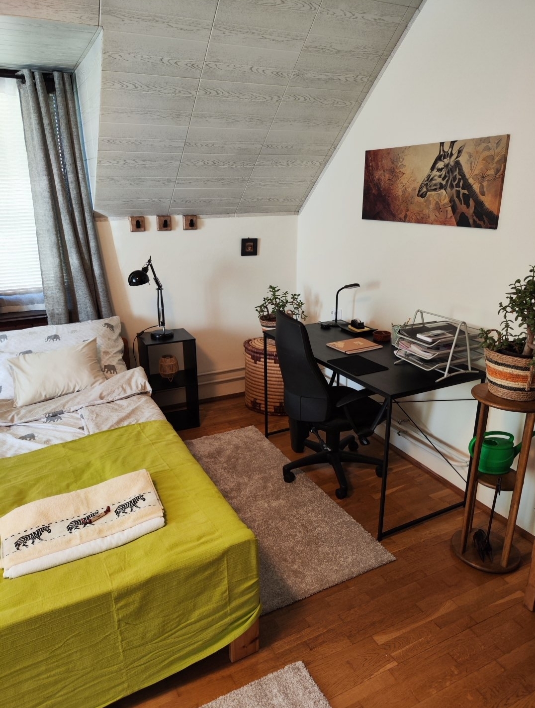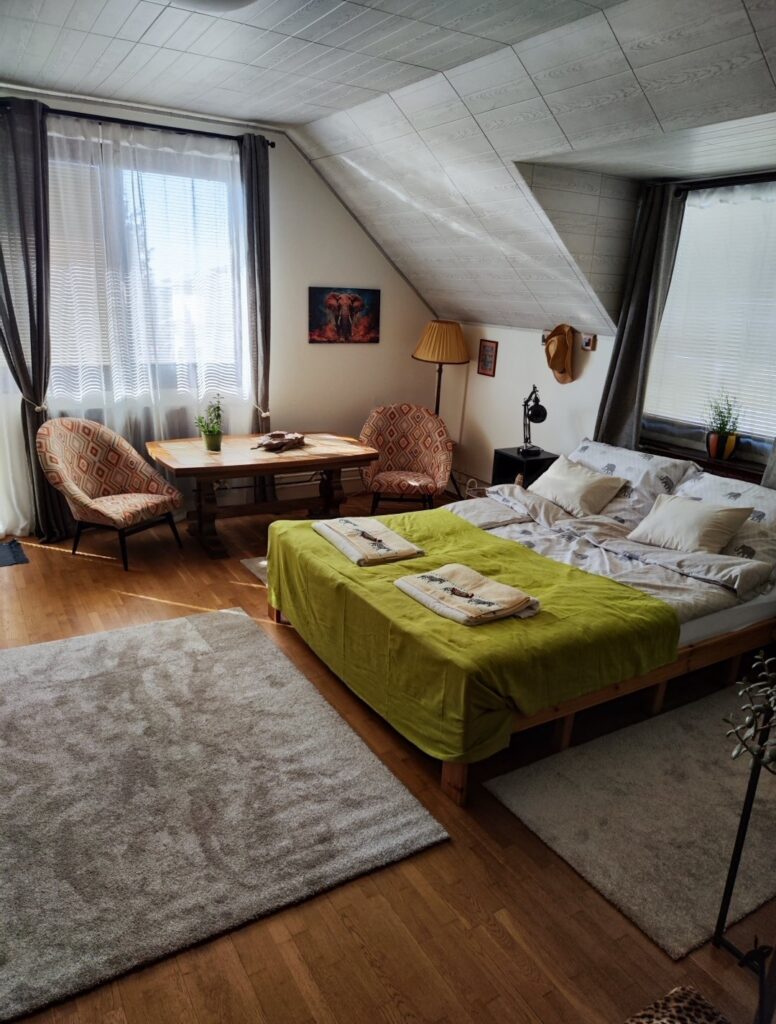 a főváros kertvárosi részén, nyugodt környezetben, egy kertes ház emeletén található. A szálláshely csendes utcában helyezkedik el, távol a város zajától, de kiváló közlekedési lehetőségekkel rendelkezik. A 65 m²-es apartman kényelmes helyet biztosít pároknak, családoknak vagy akár üzleti úton lévőknek is. Két szoba két-két felnőtt számára.